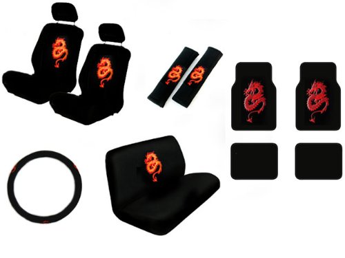 15 Piece Auto Interior Gift Set - Dragon Red - 2 Front Seat Covers (2 Front and 2 Bottom), 2 Headrest Covers, 2 Seat Belt Shoulder Pads, 1 Steering Wheel Cover, 1 Bench Seat Cover (1 Top and 1 Bottom), 4 Floor Mats (2 Front and 2 Rear) Overview